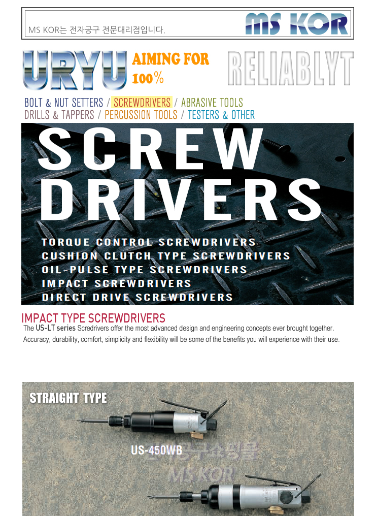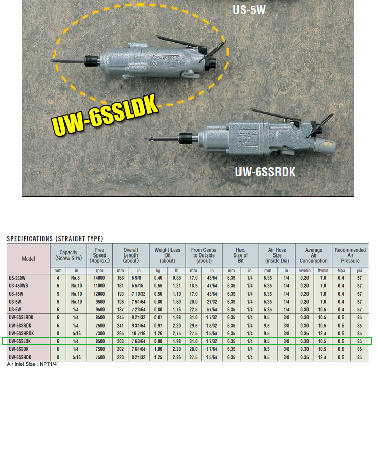 URYU TORQUE CONTROL AIR SCREWDRIVER (STRAIGHT-TYPE) UW-6SSLDK, Screw 6mm, 9500 RPM, Air Hose 9.5mm, Hex 6.35mm