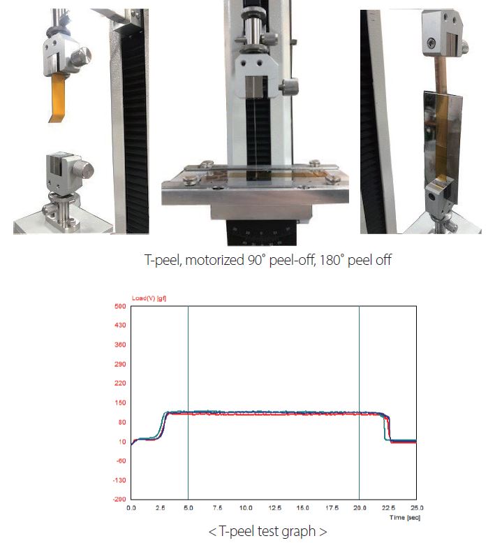 In particular, a load cell with a capacity close to the expected load allows for a more variable peel strength measurement . Peel-off test according to international standards such as ASTM, KS, DIN, JIS etc. for most films and adhesive tapes can be tested according to the user's requirements.