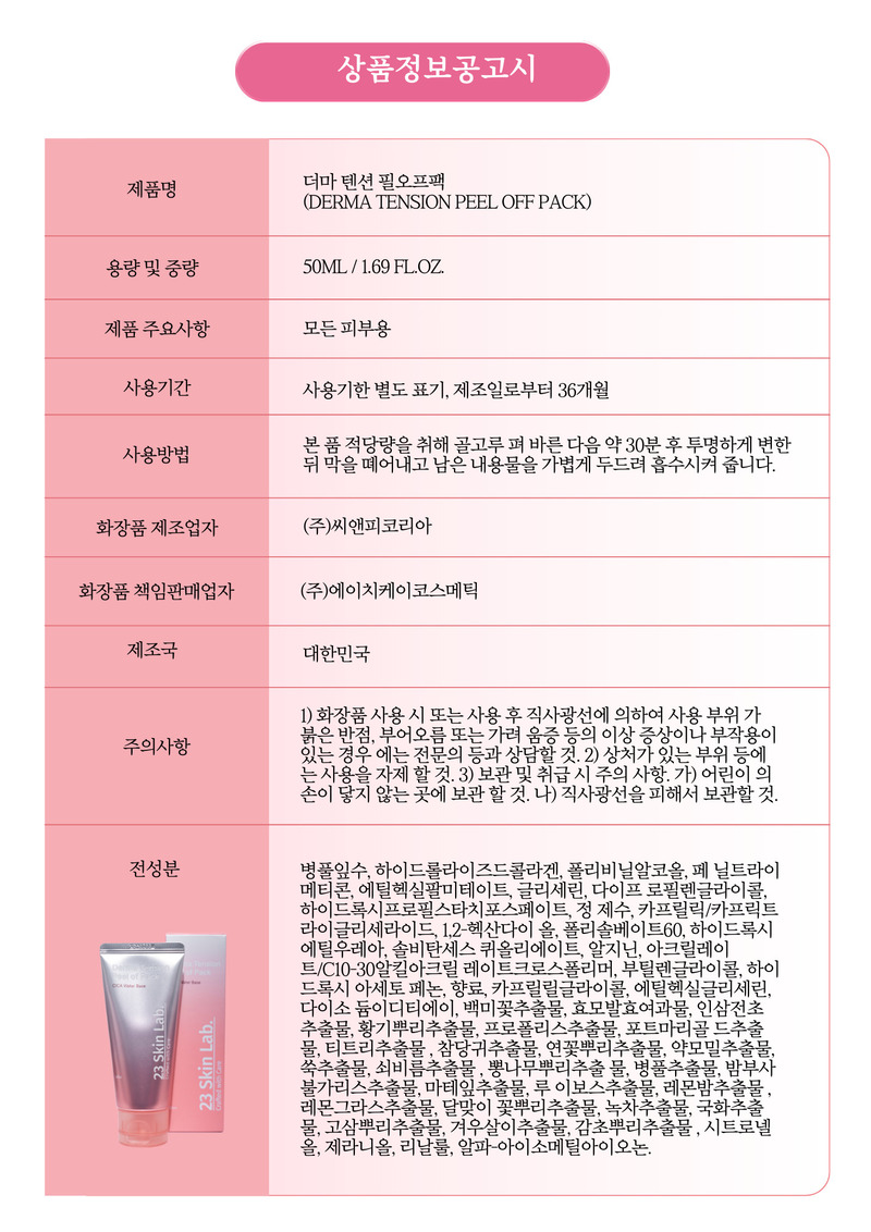 23 Skin Lab Derma Tension Peel off Pack 50ml CICA Water Base Collagen for Glass Skin Glow _ Made in KOREA