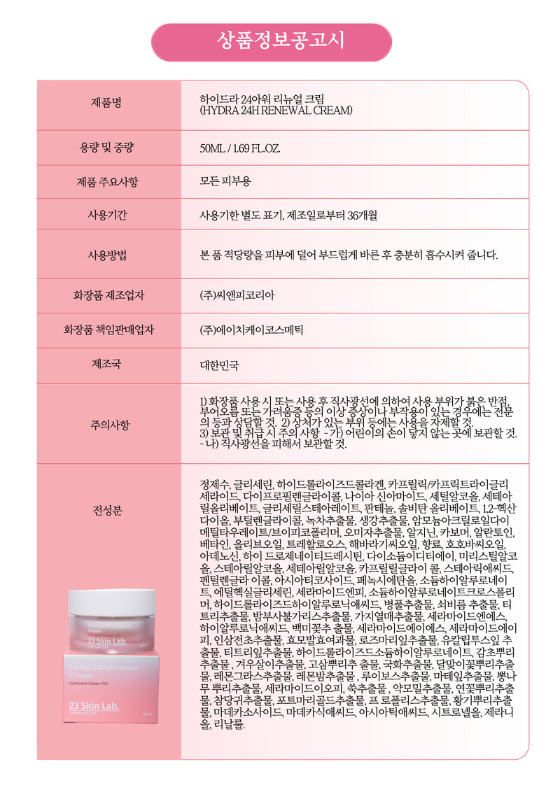 23 Skin Lab Hydra 24H Renewal Cream 50ml 5-Layer Ceramide & Collagen Barrier Repair _ Made in KOREA