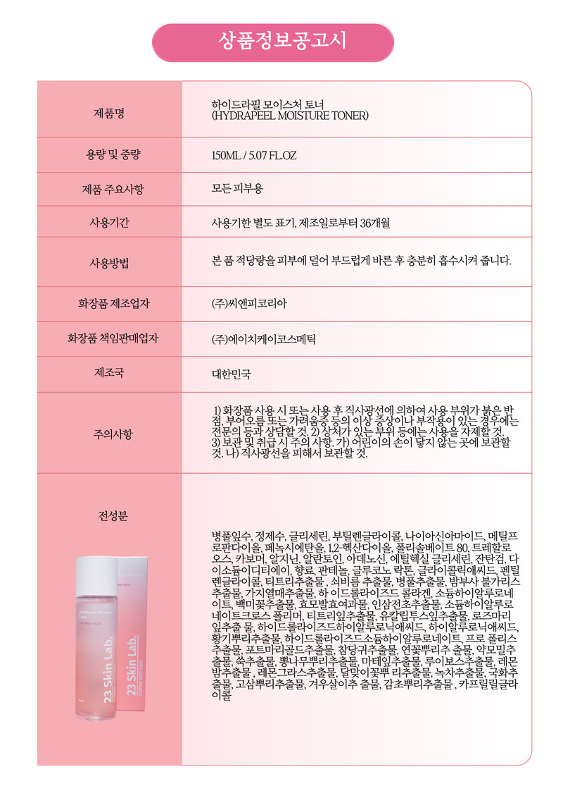 23 Skin Lab Hydrapeel Moisture Toner 150ml CICA Water 44.5% AHA BHA PHA for Smooth Texture _ Made in KOREA