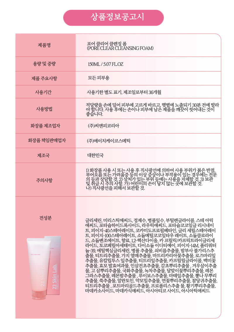 23 Skin Lab Pore Clear Cleansing Foam 150ml CICA Water Base Deep Pore Tightening Makeup Remover _ Made in KOREA