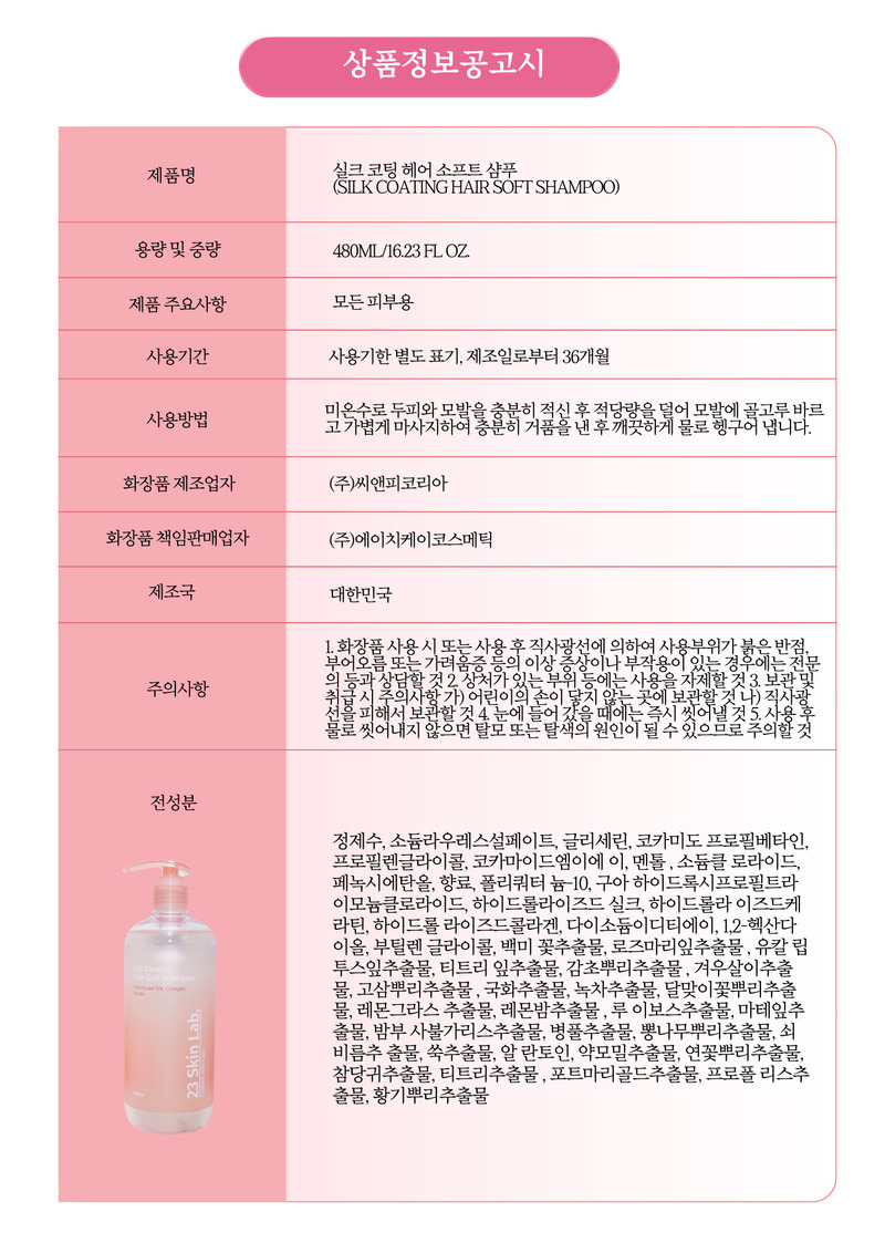 23 Skin Lab Silk Coating Hair Soft Shampoo 480ml Hydrolyzed Silk & Collagen for Damaged Hair _ Made in KOREA