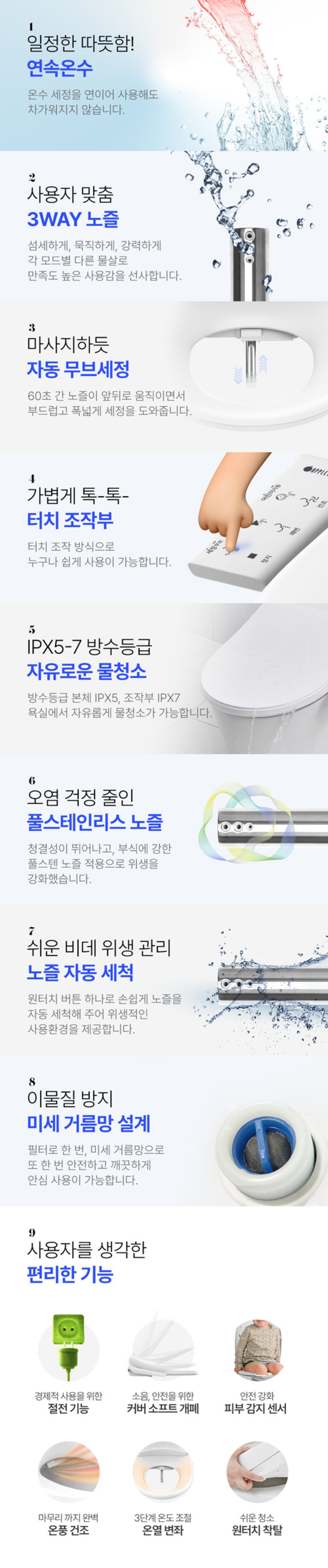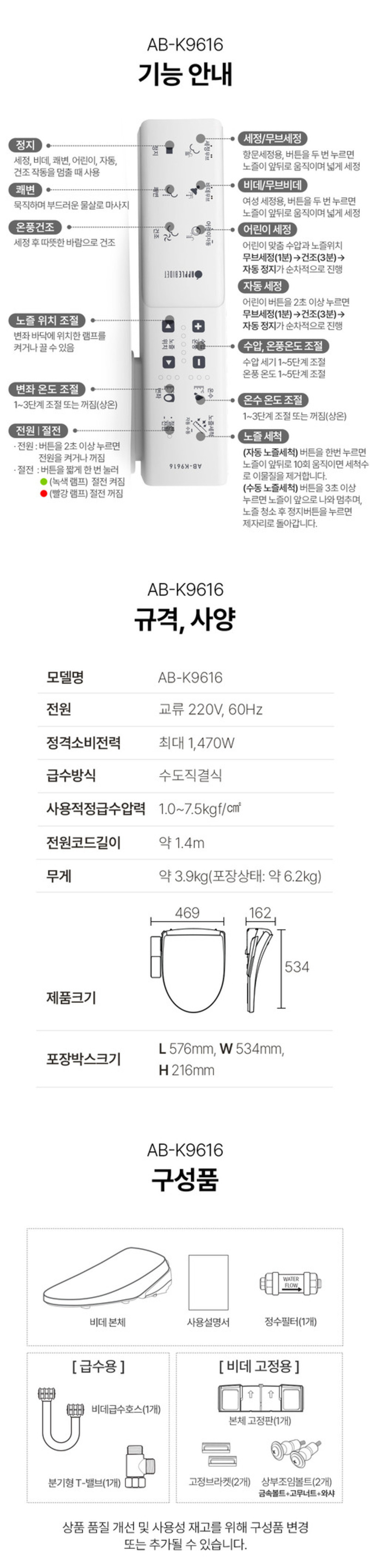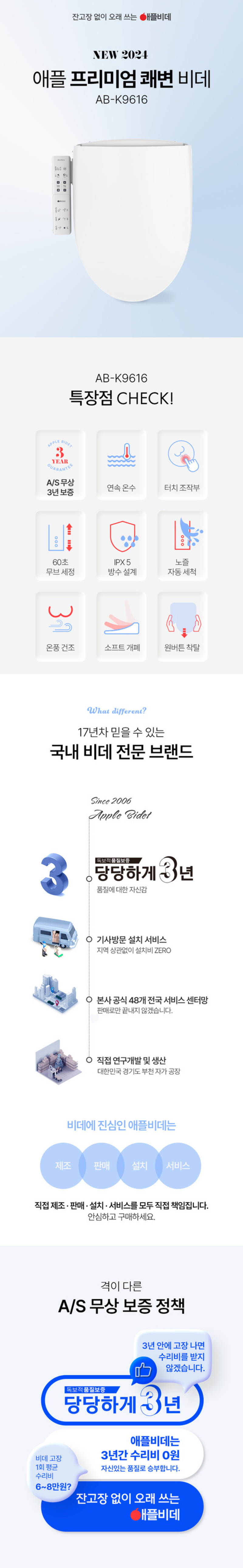 Apple Bidet AB-K9616, Direct Water and Touch Control Bidet, Stainless Steel Nozzle, Waterproof(IPX5~7), Continuous Warm Water System - Made in Korea