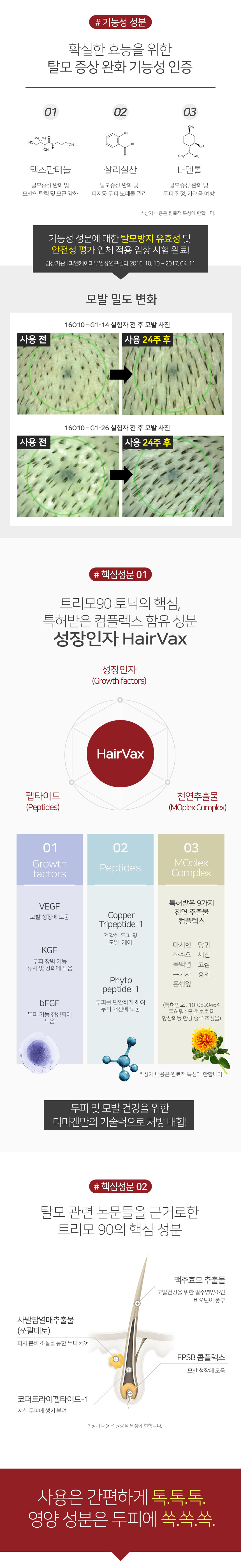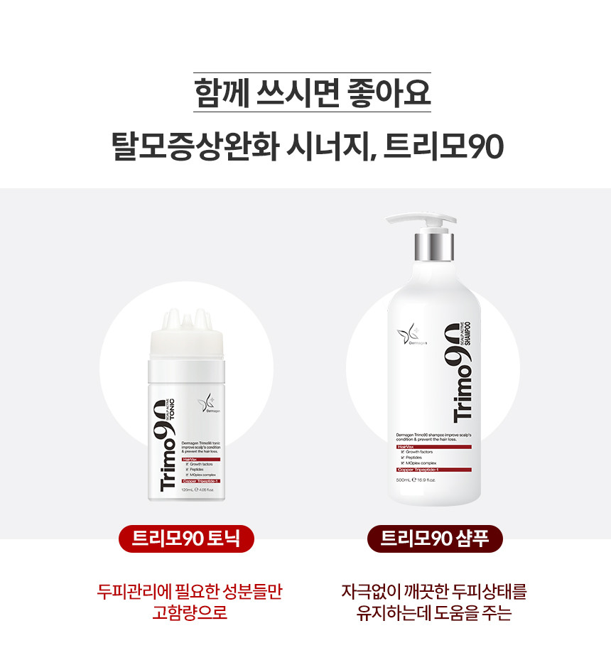 • 90-Day Scalp Care Commitment: “Trimo90” represents a 90-day program for scalp and hair care. Each bottle contains enough product for consistent 3-month daily use.