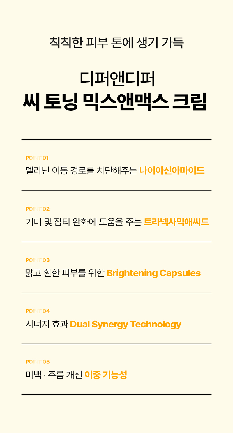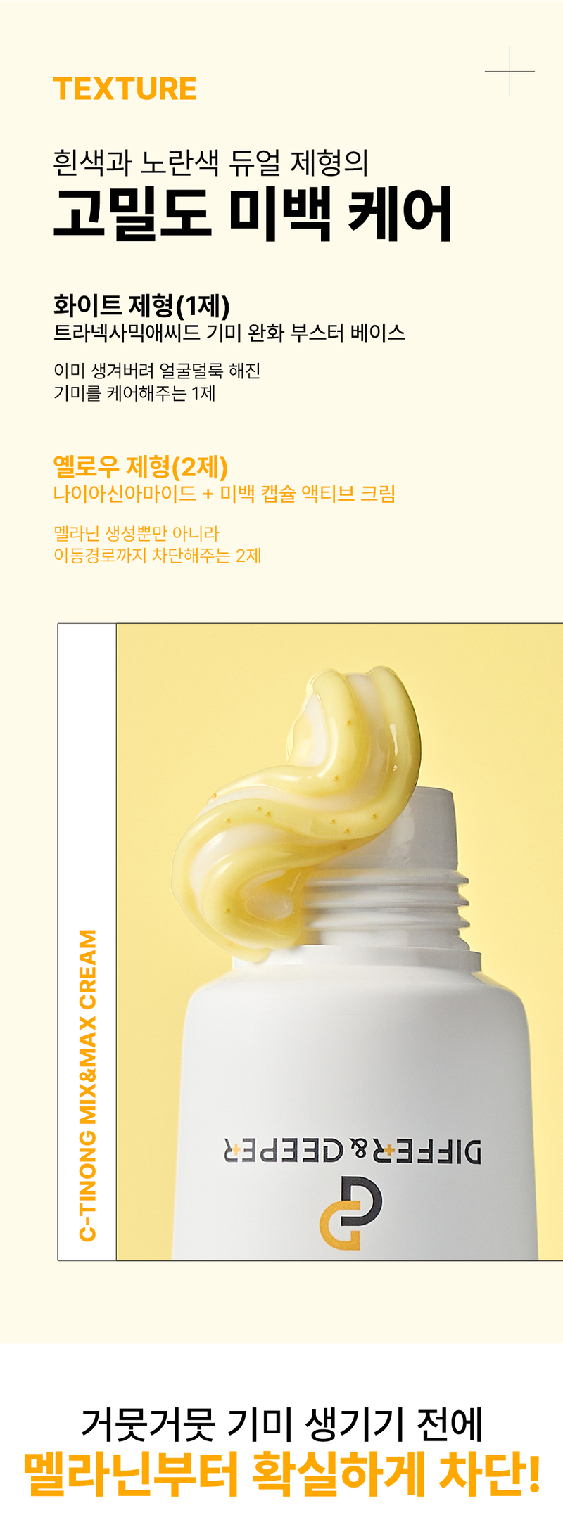 Stop melanin in its tracks with the DIFFER&DEEPER C-Toning Mix and Max Cream. This high-density whitening care features a white and yellow dual formula that simultaneously targets existing dark spots and prevents new ones from forming, delivering a visible change in just 14 days