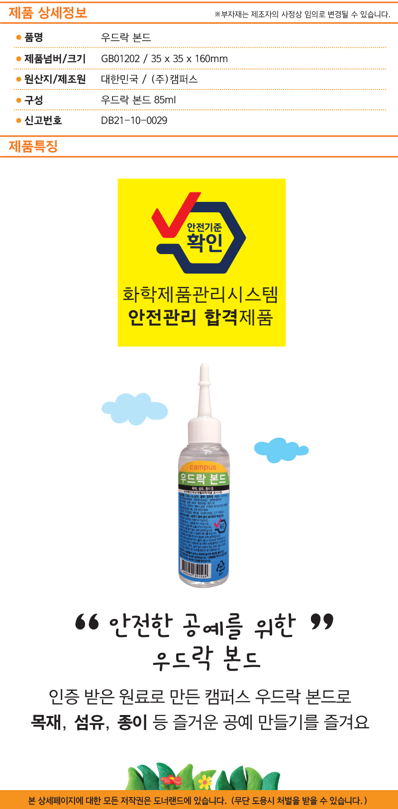 This high-quality glue is perfect for bonding a variety of materials, including wood, fabric, paper, and foam boards (Woodrock), making it a versatile tool for any DIY enthusiast. Safety is at the core of this product; it is made from certified raw materials and has successfully passed the rigorous Chemical Product Management System (K-REACH) safety standards. Its precise nozzle allows for neat application on intricate pieces, ensuring a strong and clean bond without damaging the materials. Proudly made in Korea, Donerland Campus Woodrock Glue provides the reliability and safety needed for both children's art classes and professional hobbyist workshops.