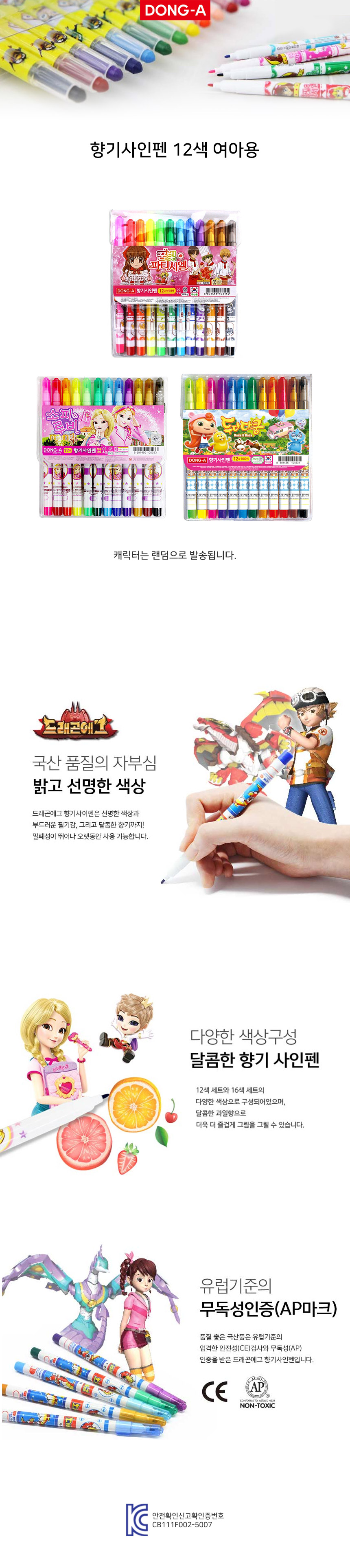 DONG-A 12-color scented pens feature brilliant pigments infused with pleasant aromas to make coloring more engaging. The high-performance airtight caps prevent ink from drying out, ensuring the pens stay fresh for extended use. Packaged in a lovely pink case with random popular character designs, these pens provide a soft touch and vivid results. Certified safe by ACMI (AP), CE, and KC, they offer a secure and aromatic creative experience for school or home.