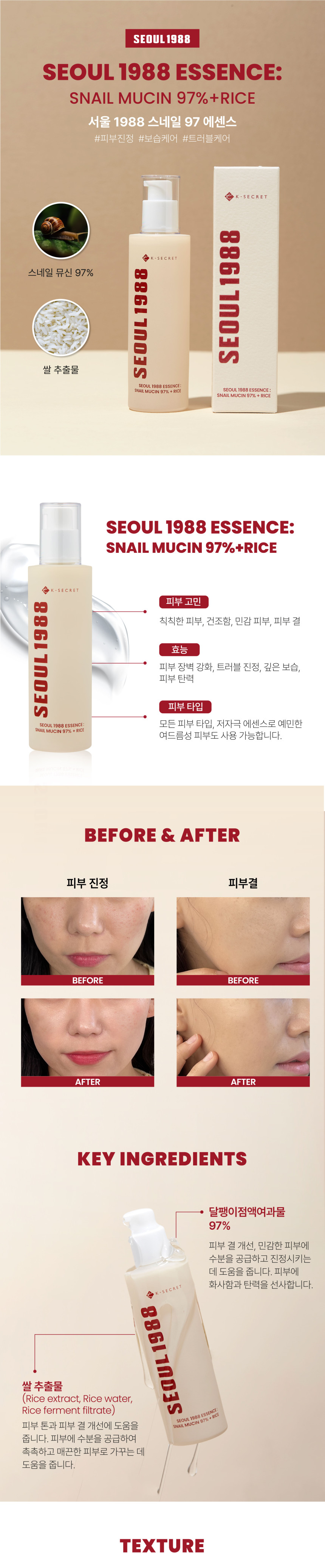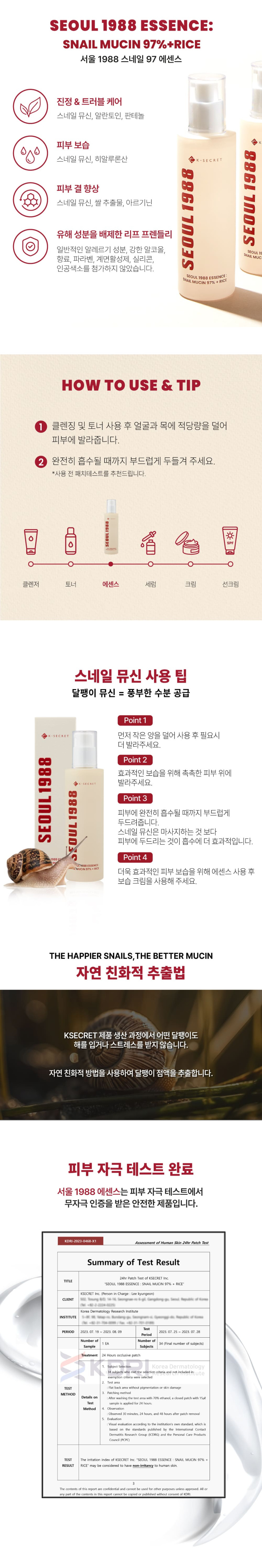 K-SECRET SEOUL 1988 Essence Snail Mucin 97% and Rice 100ml for Soothing Hydrating Skin Barrier Care _ Made in Korea