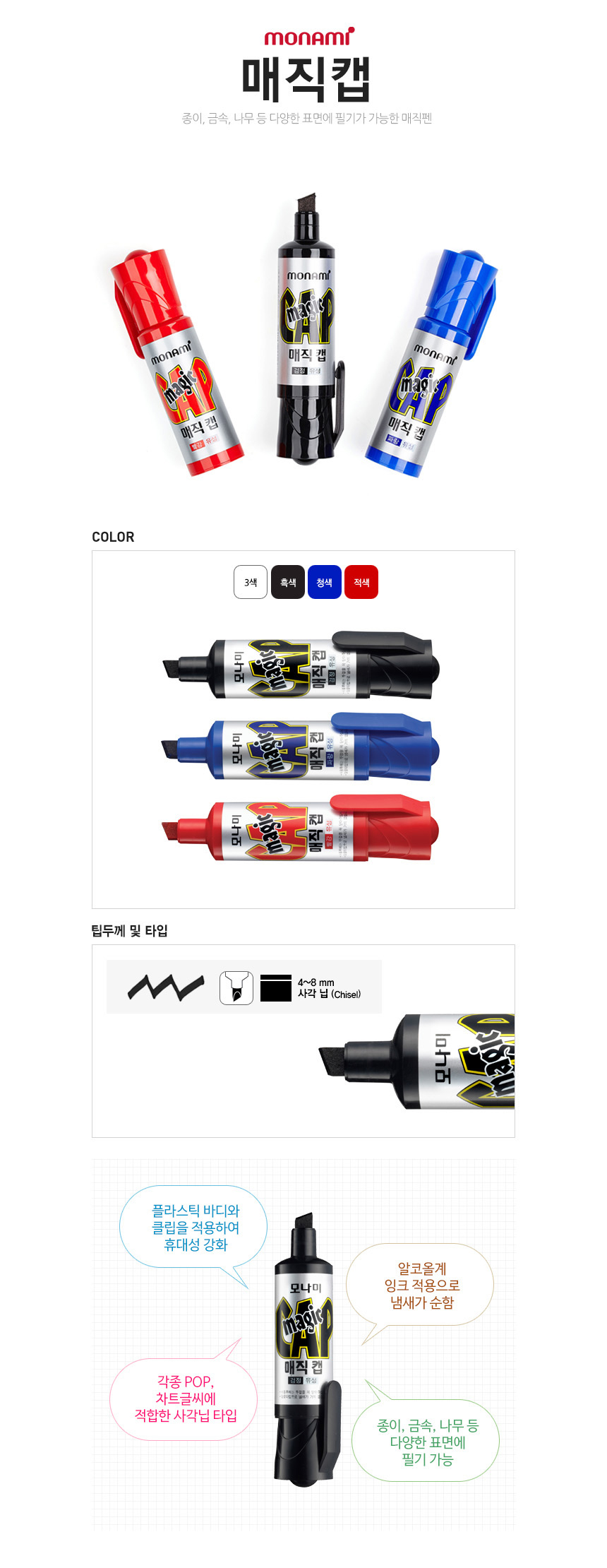 [Monami] Capped Permanent Marker | Chisel Nib (4–8mm) | Portable Clip | Mild Odor Alcohol Ink | Made in Korea
