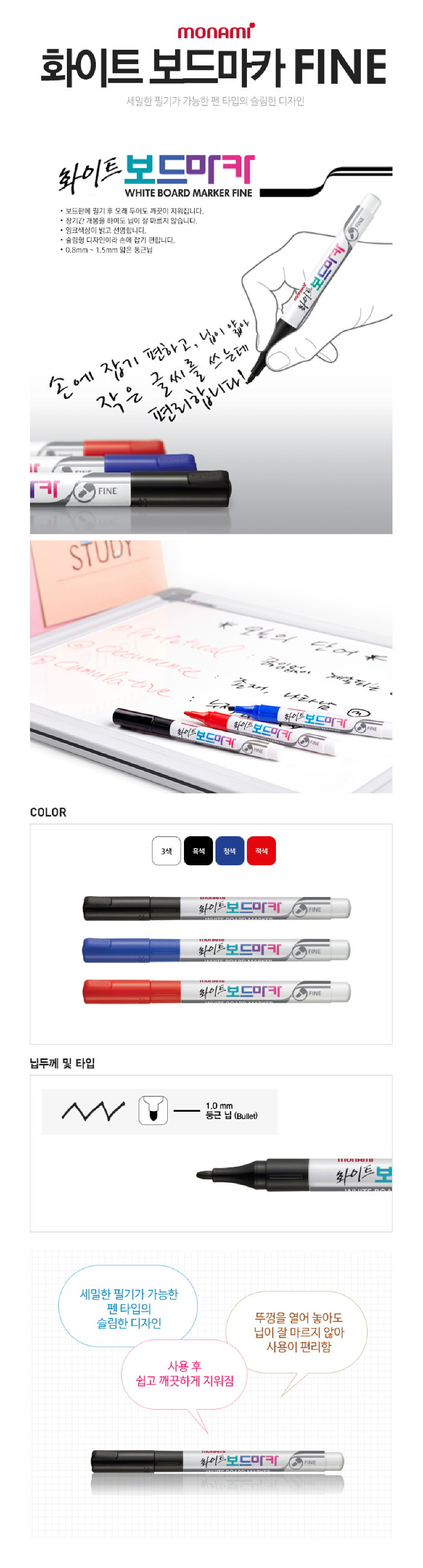 [Monami] Fine Tip Whiteboard Marker 1 Dozon (12 Pieces) | Round Nib 1mm (Slim Design) | Non-Drying Nib Feature | Made in Korea