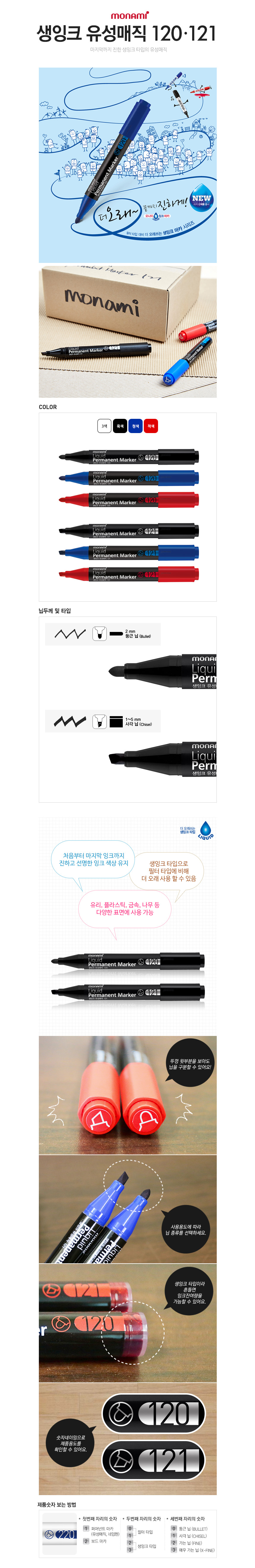[Monami] Wet Ink Permanent Marker 121, 1 Dozon (12 Pieces), 3 Colors (Black, Blue, Red) | Chisel Tip 1–5mm | Long-Lasting Ink | Made in Korea