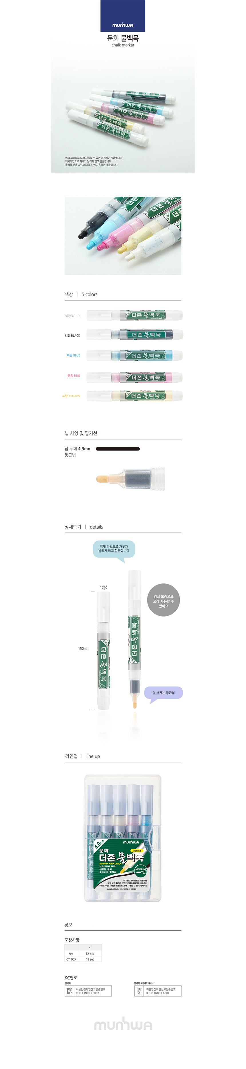 The MUNHWA Deojon Liquid Chalk Marker is a high-performance alternative to traditional chalk. Its liquid ink formula ensures a dust-free experience, making it ideal for classrooms and offices where air quality and cleanliness are priorities. Featuring a durable 4.9mm bullet tip, it delivers bold and clear lines that are easily visible from a distance. One of its most sustainable features is the refillable ink system, allowing for long-term use and cost savings. Available in five vibrant colors—White, Black, Blue, Pink, and Yellow—it offers versatility for all your presentation needs. Proudly made in Korea and KC certified for safety.