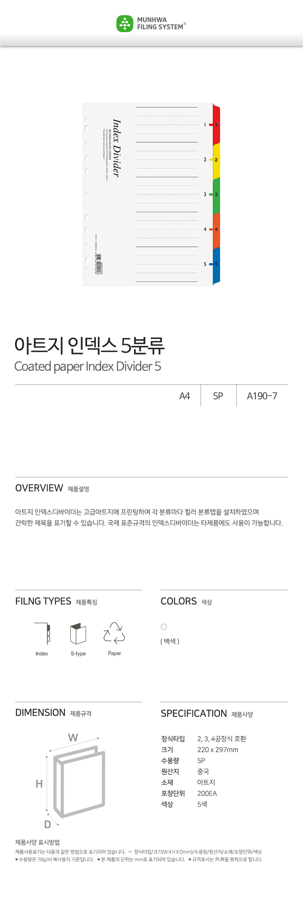 The Munhwa File Art Paper Index Dividers offer a classic and highly practical solution for organizing daily documents and short-term projects. Crafted from premium coated art paper, these dividers feature 5 vibrant multi-colored tabs that allow users to easily write down specific titles or subjects for custom indexing. Engineered to meet international standard specifications, they ensure seamless compatibility with all standard binders, making them the perfect choice for keeping your office reports, school subjects, and home files neatly structured.