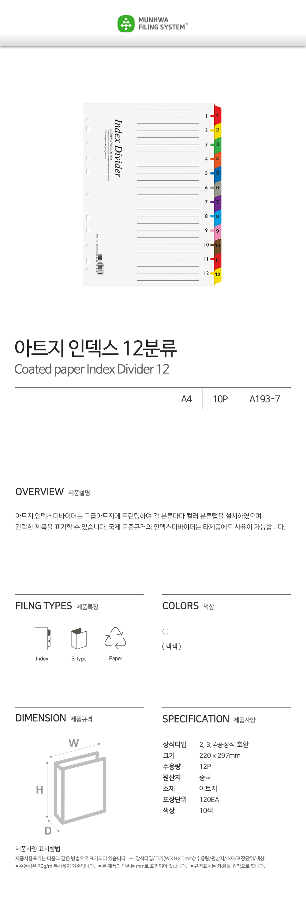 The Munhwa File Art Paper Index Dividers offer a classic and highly functional solution for systematic document management. Crafted from premium coated art paper, these dividers feature vibrant color-coded tabs that allow users to easily write down custom titles or subjects. With 12 distinct sections, they are perfectly optimized for monthly filing (Jan-Dec) or categorized projects. Designed to meet international standard specifications, they ensure seamless integration with various binder systems for professional office and academic use.