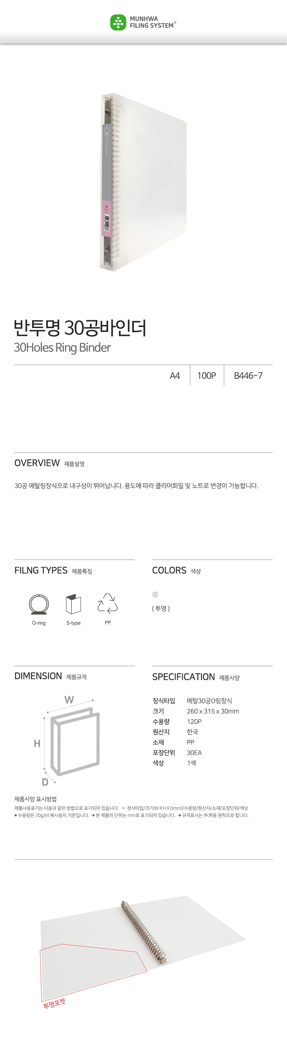 Munhwa File B446-7 Professional A4 Translucent 30-Ring Metal Binder for Customizable Notebook and Clear File System Made in Korea
