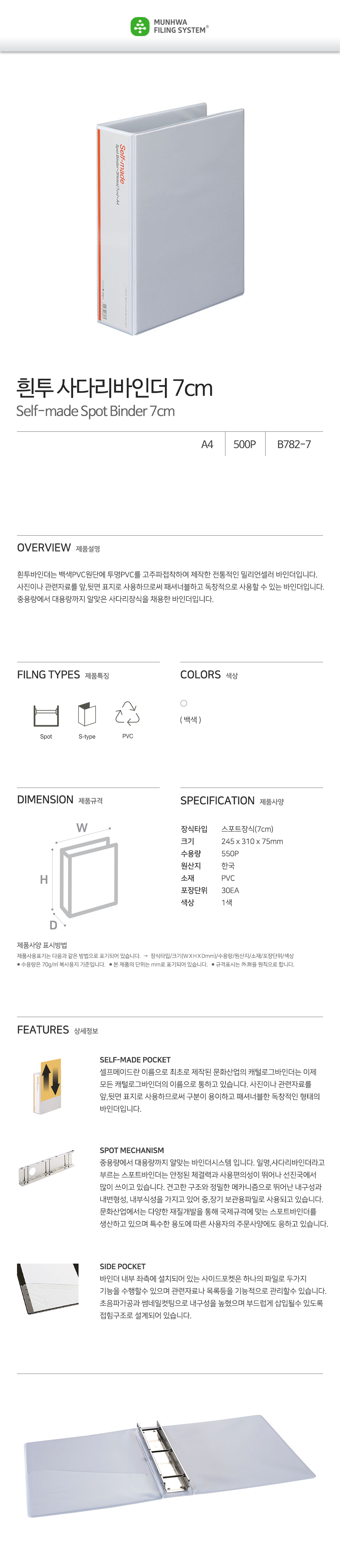 The Munhwa File B782-71 Custom View Binder is a premium organizational solution that balances high capacity with a sleek profile. Featuring the original "Self-Made Pocket" system, you can fully customize the front, back, and spine by inserting your own designs or labels. Engineered with a heavy-duty 3-D-Ring (Spot) mechanism, it provides exceptional closing stability and durability, easily holding up to 550 sheets. This binder is widely used in corporate environments for presentation portfolios, training manuals, and long-term project filing.