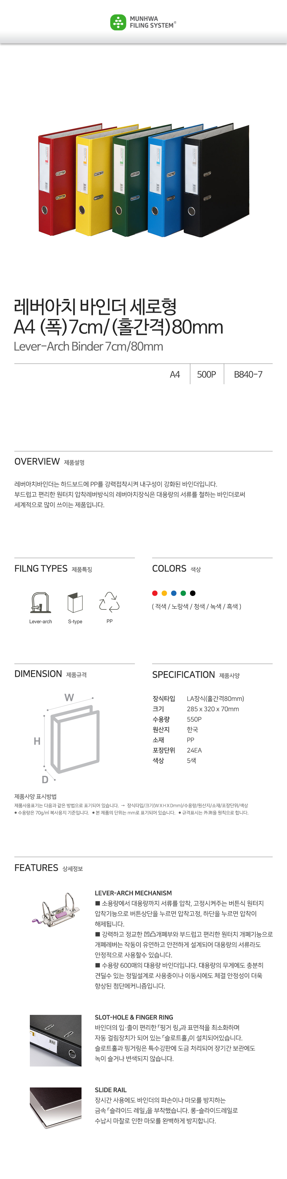 The Munhwa File B840-71 Lever Arch Binder is a world-class organizational tool designed for heavy-duty professional use. Featuring a durable PP-laminated hardboard construction, it offers unmatched rigidity and longevity. Its core is the precision-engineered one-touch lever mechanism, allowing for effortless opening and firm document compression. Equipped with protective metal slide rails to prevent bottom wear and dual slot-holes for secure closure, this binder is the global standard for managing large-scale reports, legal documents, and permanent archives.