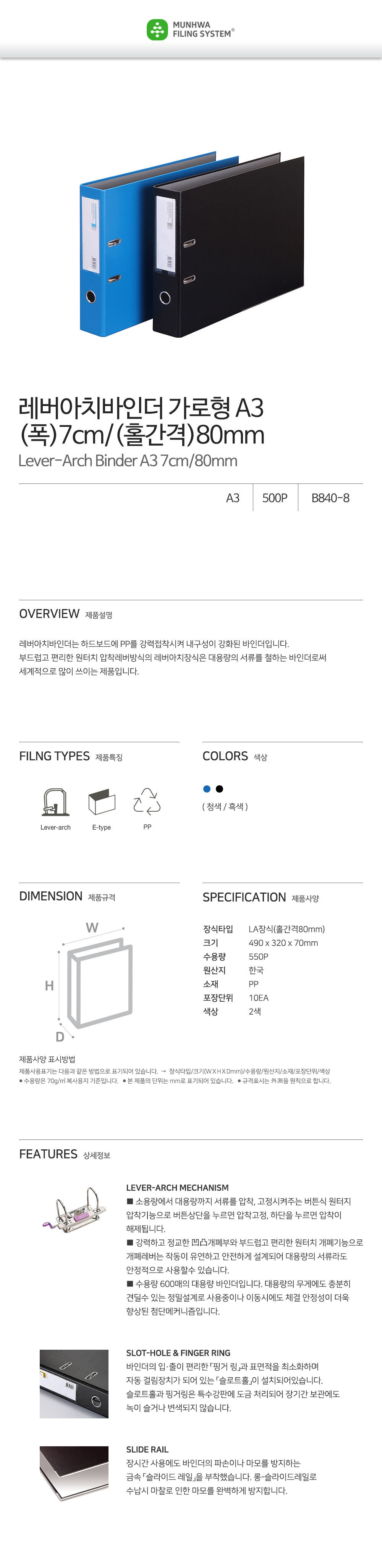 Munhwa File B840-81 Professional A3 Extra Large Lever Arch Binder 70mm Spine with Heavy-Duty One-Touch Mechanism Made in Korea