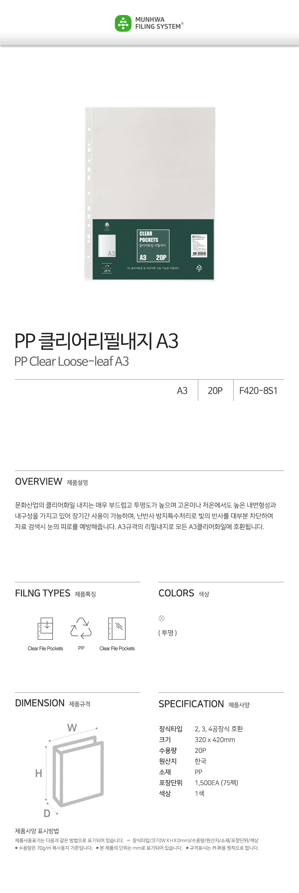 Munhwa File F420-8S1 Premium A3 Clear Refill Sleeves 0.6T Thick with Anti Glare Protection 20 Sheets Made in Korea