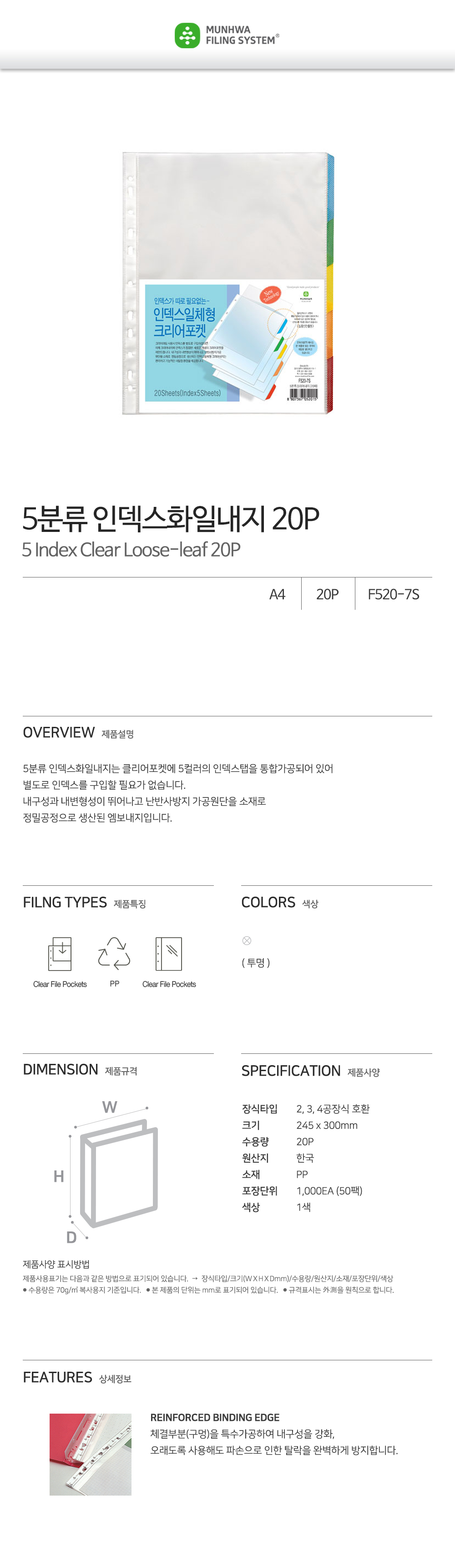 The Munhwa File 5-Tab Creare Refill Sleeves are an innovative filing solution that combines document protection and indexing into a single product. Featuring integrated 5-color index tabs, this product eliminates the need for separate dividers, making your binder management more streamlined and efficient. Each sleeve is crafted from high-quality embossed PP material with an anti-glare finish, providing a sophisticated look while significantly reducing light reflection to protect your eyesight during long periods of use.