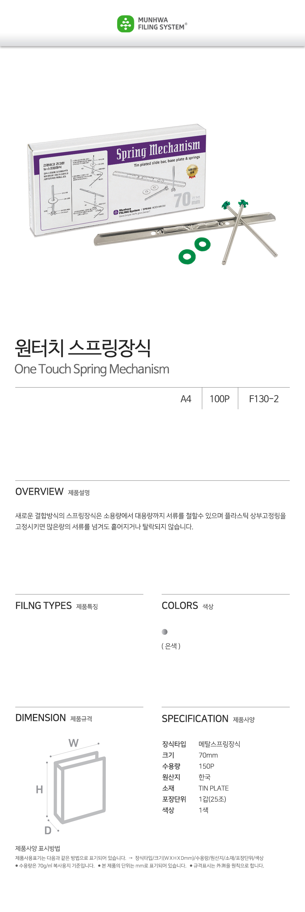 Munhwa One-Touch Metal Spring Replacement Mechanism (70mm Silver) F130-2 | 25 Sets per Pack | High-Capacity Binding Hardware | Made in Korea