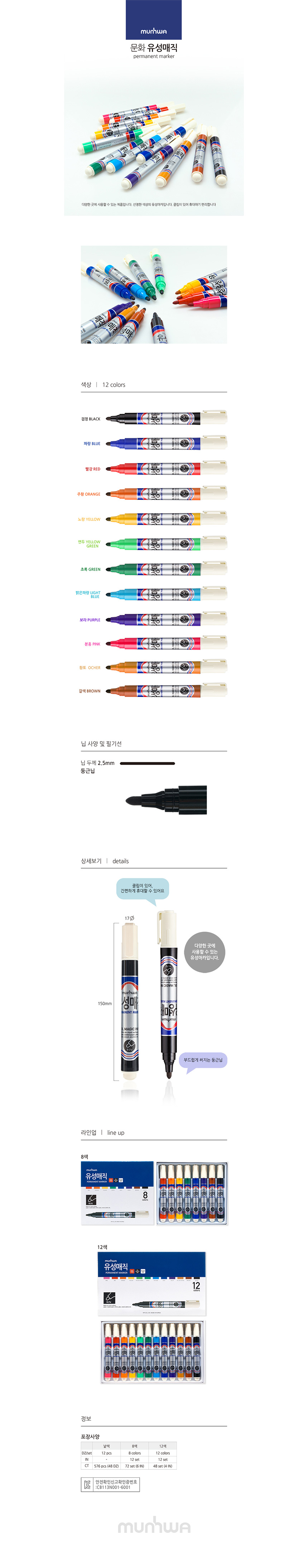 The MUNHWA Permanent Marker 12-color set is a versatile tool designed for marking on various surfaces, including metal, glass, plastic, wood, and paper. Each marker features a high-quality 2.5mm bullet tip that provides a consistent and smooth ink flow. The fast-drying, water-resistant ink ensures your markings remain bold and smudge-free for a long time. For added convenience, the cap includes a sturdy clip, allowing you to easily attach it to pockets, clipboards, or notebooks for quick access. Fully KC certified for quality and safety, this set is a reliable choice for everything from office organization to creative DIY projects. Proudly made in Korea.