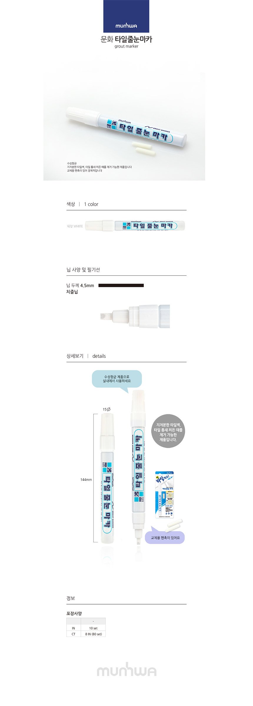 The MUNHWA Tile Grout Marker is a high-performance home maintenance tool designed to refresh dirty and discolored tile joints effortlessly. Featuring a 4.5mm chisel tip, it provides precise control to cover stained areas with a clean, white finish. The specialized water-based ink is formulated with anti-bacterial properties, preventing future mold growth and ensuring a hygienic environment. Unlike one-time use products, this marker comes with two additional replacement nibs, making it a highly economical choice for large-scale cleaning projects. Proudly made in Korea, it is the simple, pen-style solution for a professional-looking home renovation.