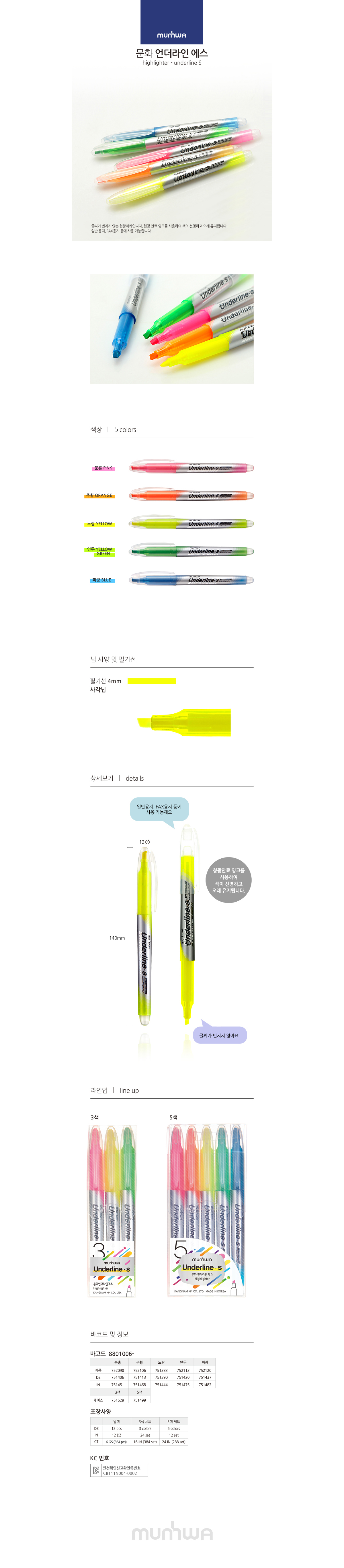 The MUNHWA Underline S 3-color set is an essential tool for effective studying and organizing. This set includes the three most popular highlighting colors: Pink, Yellow, and Light Green. Equipped with a high-quality fluorescent pigment ink, it allows you to highlight over ballpoint pens or inkjet prints without smearing the text. The durable 4mm chisel tip provides consistent line widths, making it perfect for both wide highlighting and thin underlining. Whether you are using it on standard copy paper, textbooks, or sensitive fax paper, it delivers a clean and professional result. Proudly made in Korea with premium quality.
