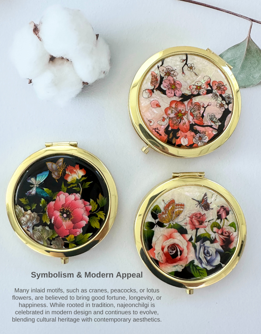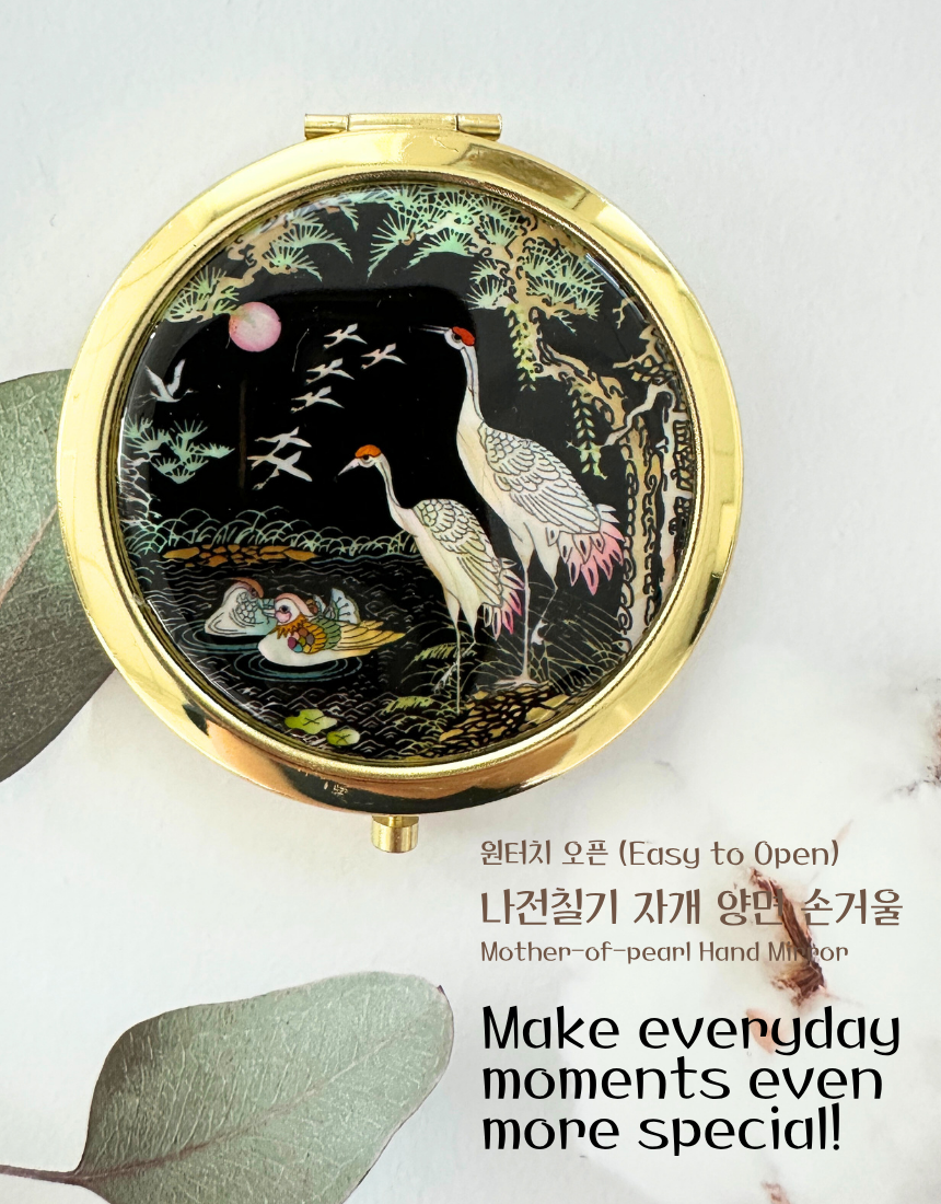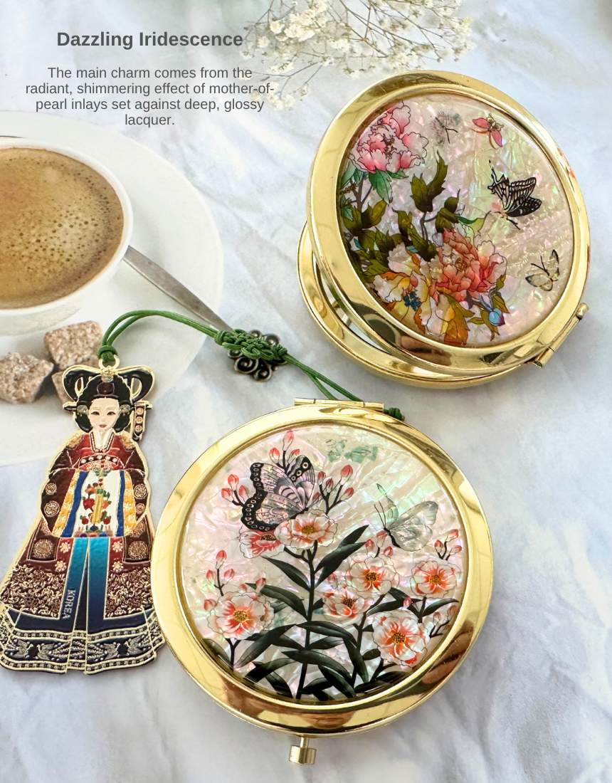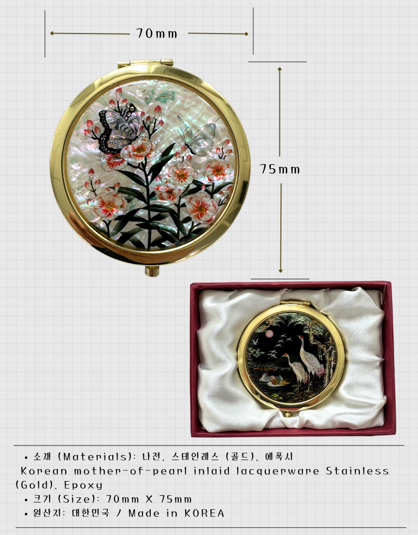 NAMIN Craft Portable Korean Mother-of-Pearl Double-Sided Compact Mirror (70mm x 75mm) Plum Blossom _ 1x Magnifying Mirror, One-Touch Open, Korean Traditional Handicraft, Souvenir, Made in Korea