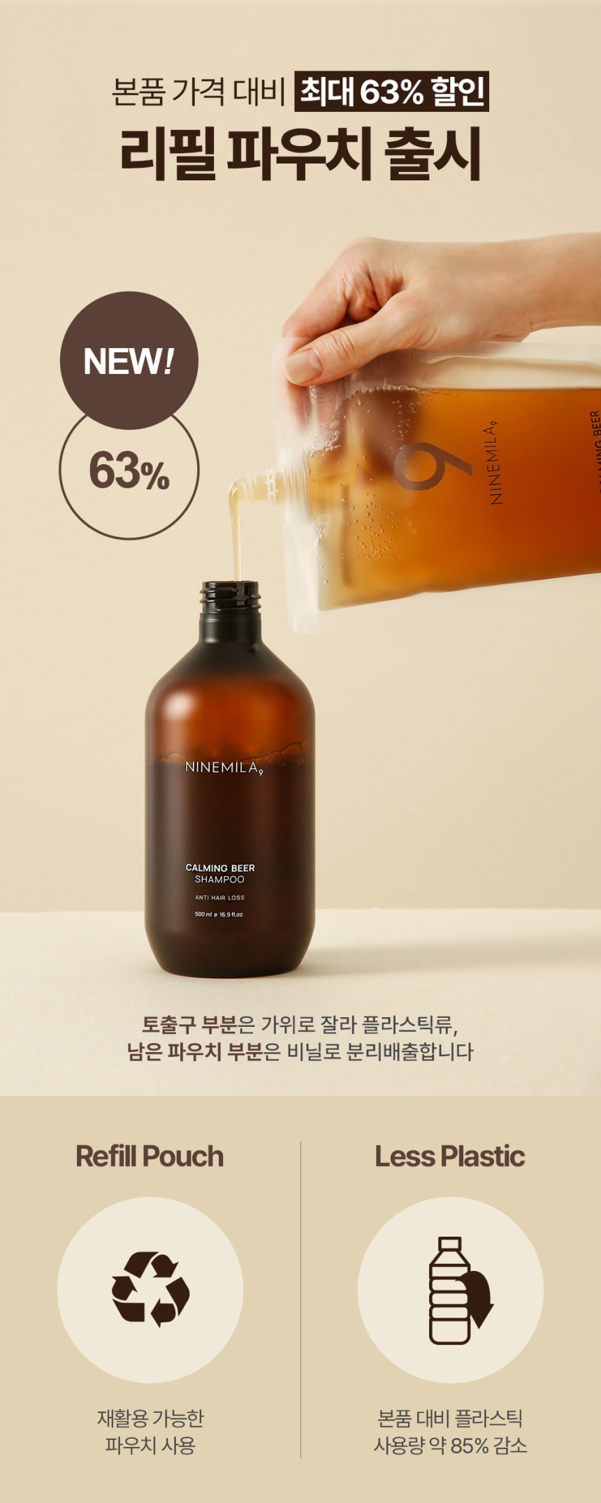 [NINEMILA] Beer Yeast (Calming Beer) Hair Loss Shampoo Refill Pouch 500ml - Patent-Protected Beer Yeast & Collagen for Gentle Scalp Care Made in Korea