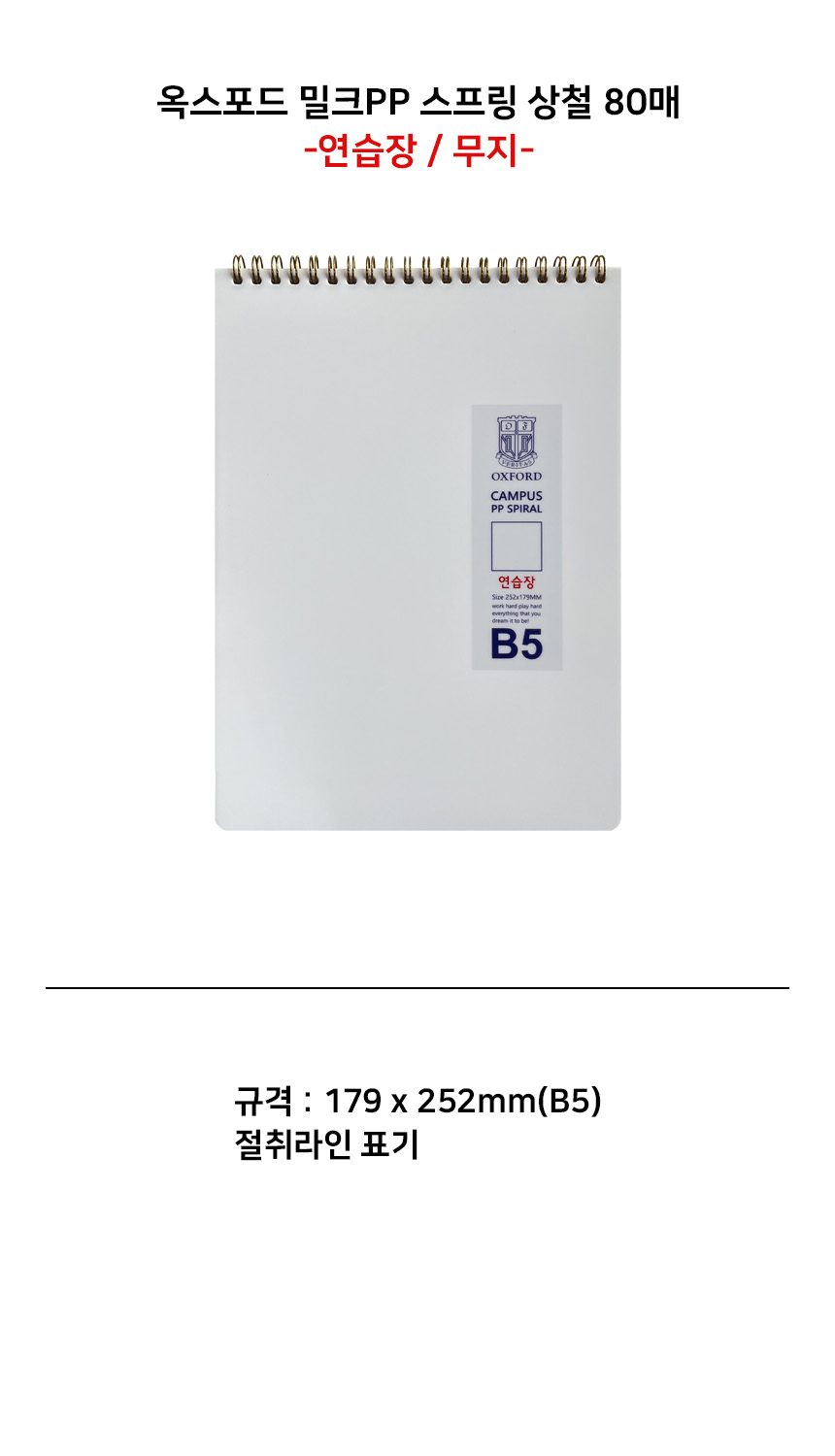 [Oxford] 4000 Milk PP Cover Top Spiral Perforated Notebook B5 Blank | Unruled / 80 Sheets | 252*179mm | Top Twin Spiral Bound | Made in Korea