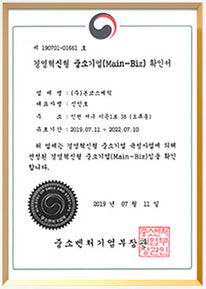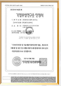 Certificate : Certificate of accreditation of company-affiliated research institute Certification agency : Korea Industrial Technology Association