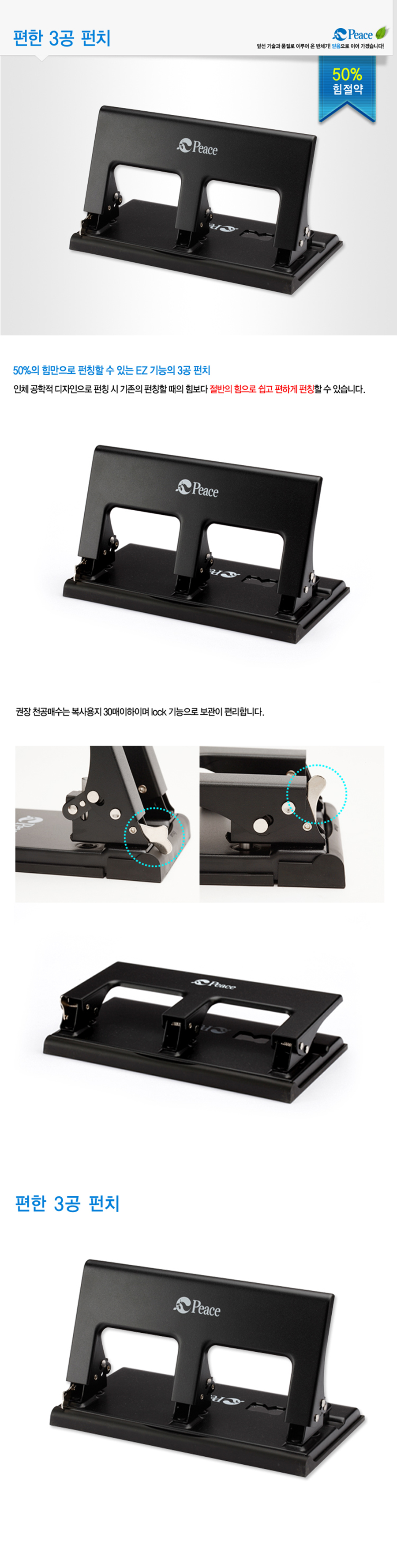 [PEACE] Easy 3-Hole Punch | 25-30 Sheet Capacity | 50% Less Force (EZ Function) | Handle Lock | Made in Korea