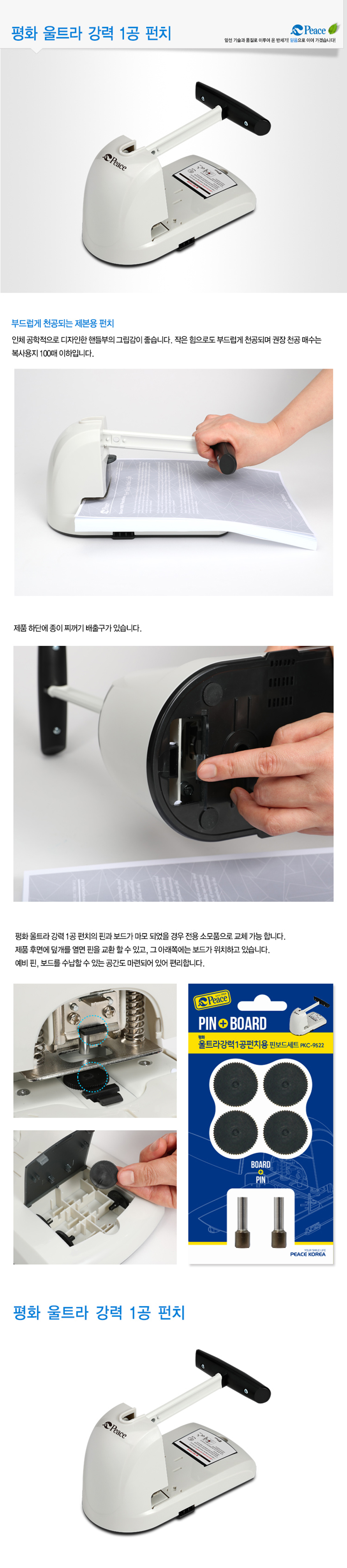 [PEACE] Ultra-Heavy-Duty Single-Hole Punch | 100-Sheet Capacity | Replaceable Pins & Boards | Storage Space Included | Made in Korea