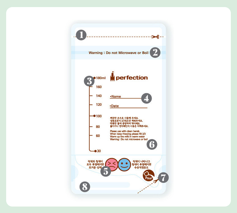 | Product name and model name | Perfection 2-way nano breast milk storage pack 180ml 30 sheets |