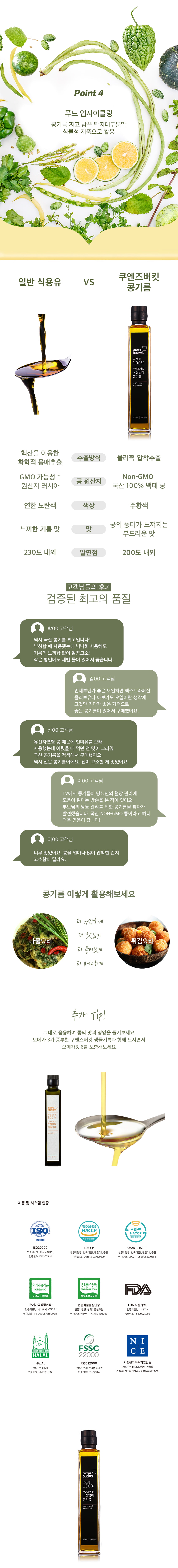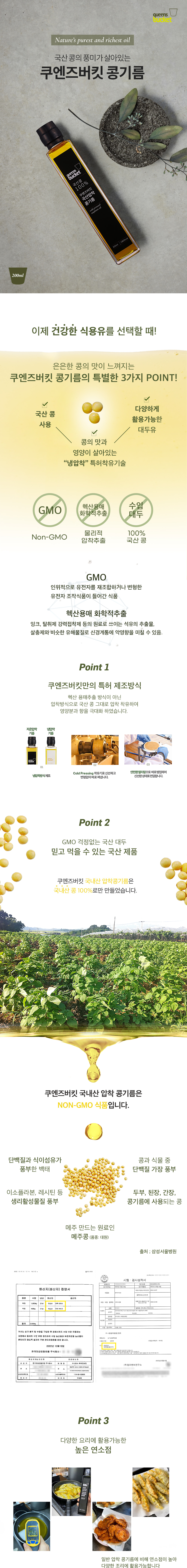 Queens Bucket Soybean Oil is made from 100% Korean Non-GMO soybeans (Baektae) using a patented cold-pressing method instead of the common hexane solvent extraction.