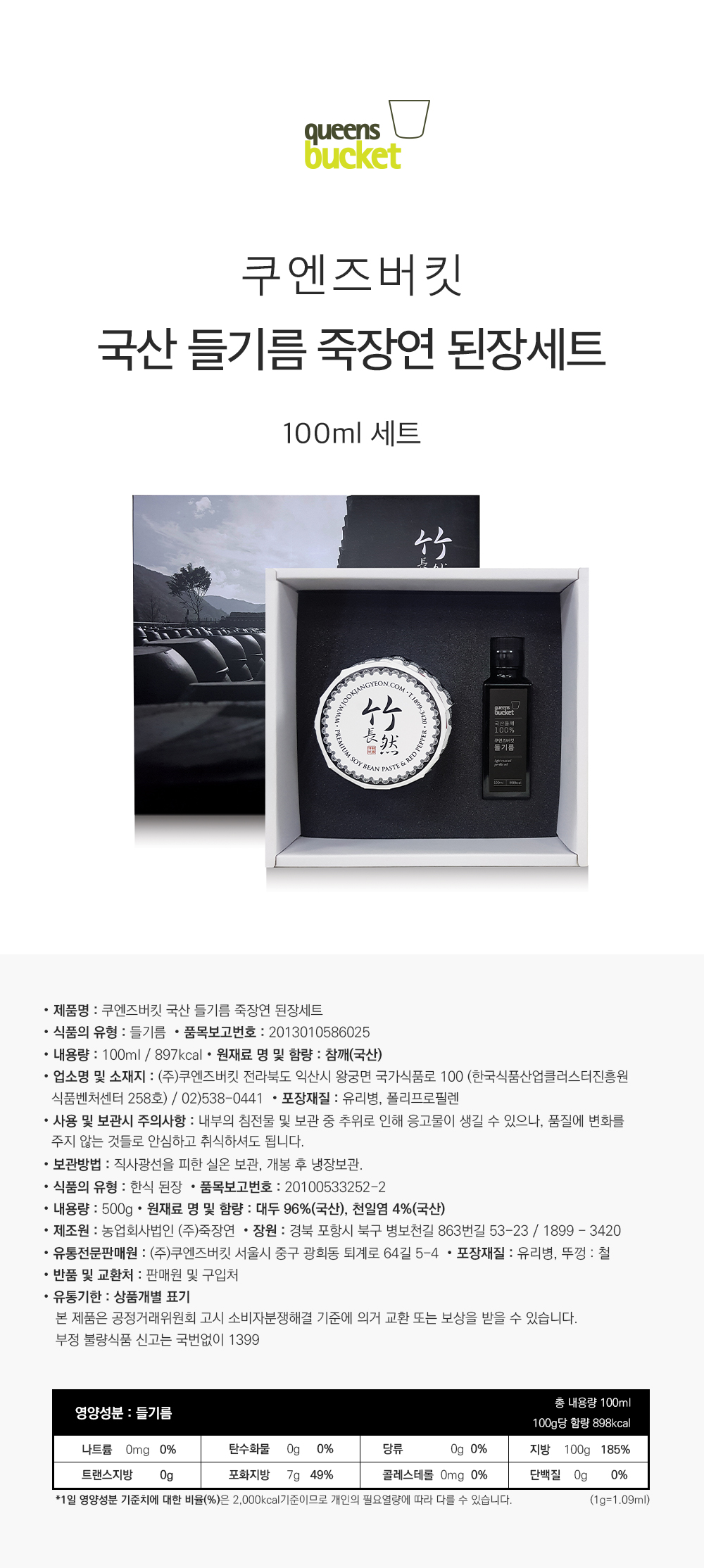 QUEENSBUCKET Perilla Oil 100ml & Jukjangyeon Doenjang (Korean Fermented Soybean Paste) 500g Set _ Premium Cold-Pressed Oil & Traditional Korean Paste