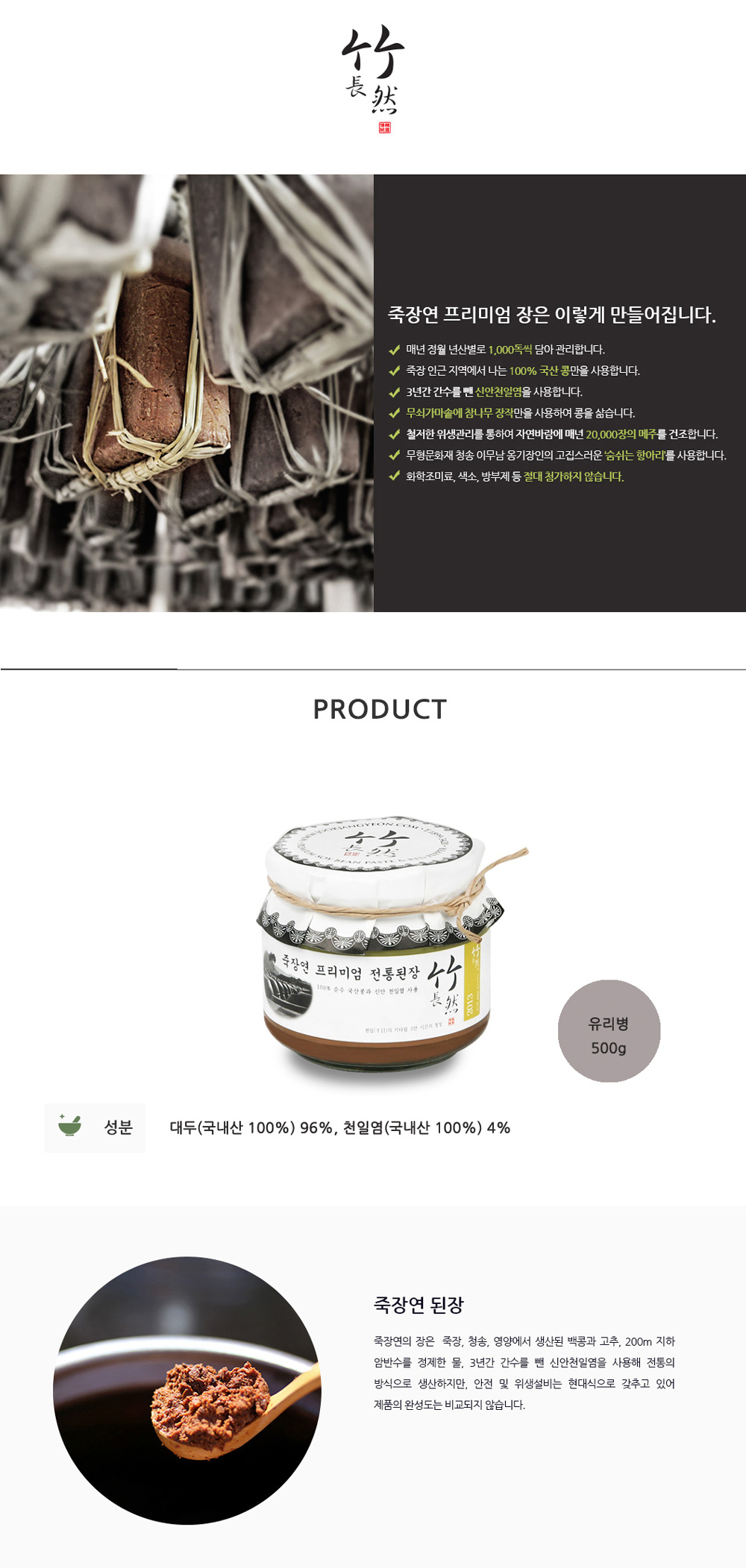 Jukjangyeon Doenjang (500g) : A premium traditional Korean soybean paste made with 100% Korean soybeans and sun-dried sea salt.