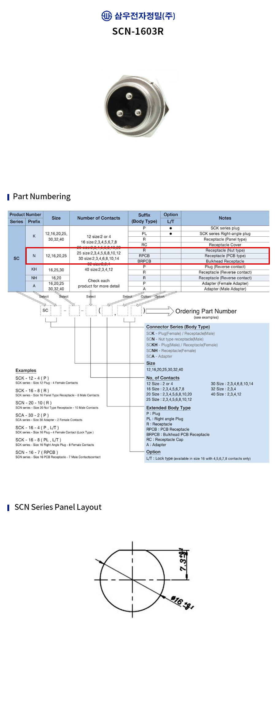 SAMWOO ELECTRONICS SCN-1603R Circular Connector Receptacle Type 3 Pin High-Precision Industrial Panel Mount Socket Made in Korea Genuine