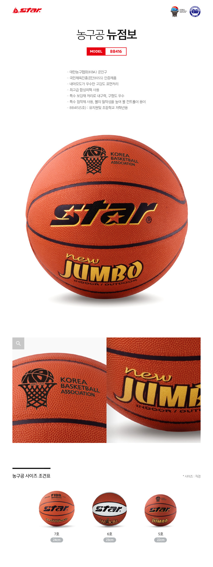The Star Sports New Jumbo BB416 is a high-performance size 6 basketball, officially certified by both the Korea Basketball Association (KBA) and the Korea Institute of Sport Science (KISS). Specifically sized for junior high school students and female players, it offers the perfect balance between weight and control. Crafted from premium synthetic leather with a high-strength surface treatment, this ball boasts exceptional wear resistance on both indoor and outdoor courts. The application of a specialized adhesive ensures a superior "tacky" grip, allowing for precise ball handling and shooting accuracy. Combined with advanced internal reinforcement that maintains a perfect spherical shape, the New Jumbo BB416 provides professional-grade durability and a consistent bounce for competitive play.