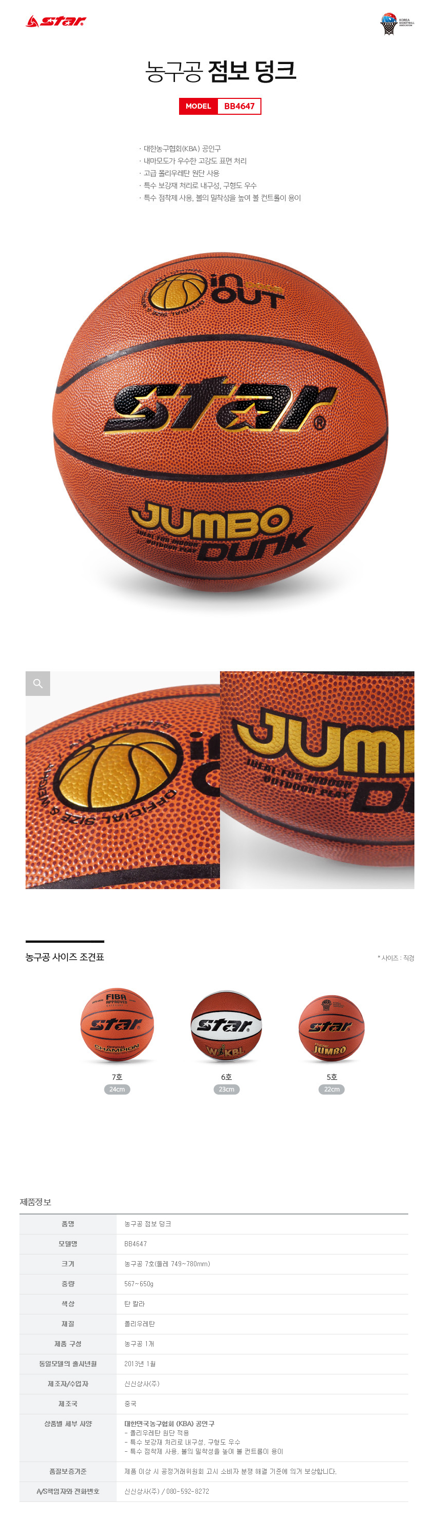 The Star Sports Jumbo Dunk BB4647 is a professional-grade size 7 basketball officially certified by the Korea Basketball Association (KBA). Designed for players who demand high-level performance, this ball is crafted with premium Polyurethane (PU) fabric and treated with a specialized high-tack adhesive to ensure maximum palm-to-ball adhesion. With its reinforced internal structural lining, the Jumbo Dunk maintains perfect sphericity and exceptional durability, making it the ideal choice for both intensive training and official competitive matches.