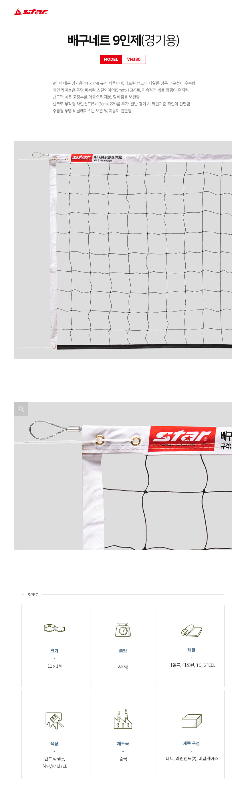 Star Sports Professional Volleyball Net for 9-Player Matches VN380 Durable Nylon Mesh with Steel Wire Cable and Velcro Line Bands 11m x 1m