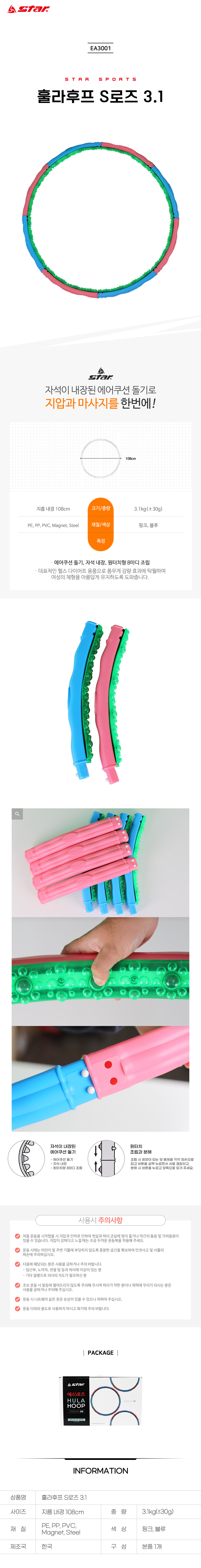 The Star Sports S-Rose Hoop 3.1kg EA3001 is the heaviest flagship model in the S-Rose series, specifically engineered for professional-level core training and maximum fat loss. Proudly Made in Korea, this 3.1kg ultra-heavyweight hoop provides immense centrifugal force, requiring significant core engagement to maintain rotation, which leads to unparalleled abdominal toning and calorie expenditure. It features Star’s signature magnetic air-cushion protrusions that deliver an intensive deep-tissue massage and acupressure effect, helping to stimulate internal organs and improve metabolic rates. Despite its massive weight, the one-touch 8-section assembly ensures it remains portable and easy to store. Built with a reinforced steel core and premium PVC/PE materials, the EA3001 offers the most powerful workout for those who have mastered standard weighted hoops.