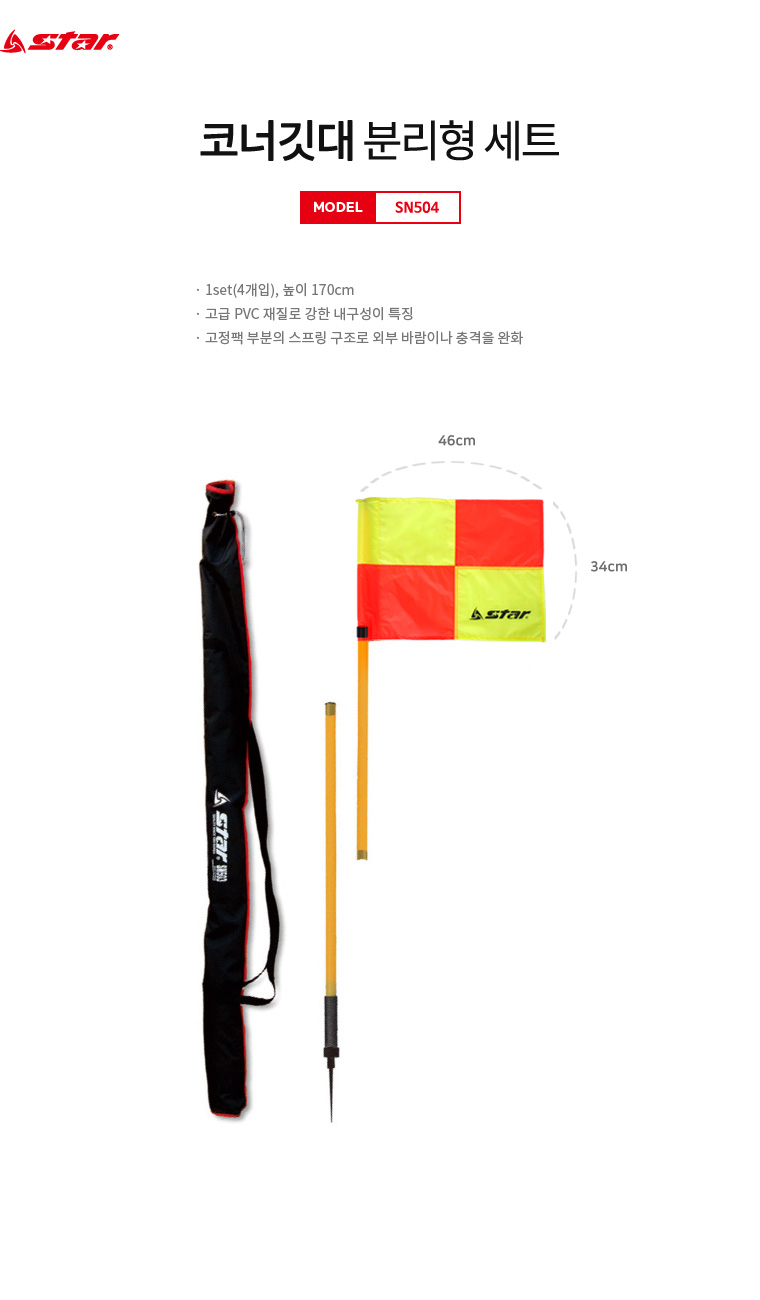 The Star Sports Corner Flag Set SN504 is a premium-grade field equipment designed for professional soccer matches and high-level training facilities. This 4-piece set stands at an official height of 170cm, providing excellent visibility for players and officials. Crafted from high-quality PVC, the poles are exceptionally durable and resistant to impact. A standout feature is the integrated spring structure at the base of each ground spike, which allows the pole to flex and absorb impact from wind or accidental player collisions, significantly reducing the risk of injury and equipment damage. The detachable pole design allows for compact storage in the included heavy-duty nylon bag, making it an ideal choice for clubs, schools, and tournament organizers who require easy transport and setup.