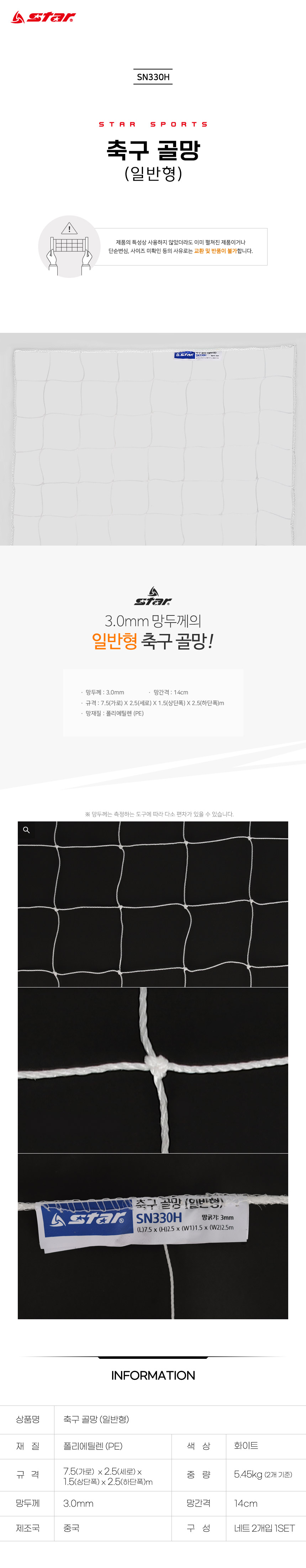 The Star Sports Soccer Goal Net SN330H is an official competition-grade replacement net designed for full-size 7.5m x 2.5m soccer goals. Engineered with a 3.0mm mesh thickness, this net provides excellent tension and resilience against high-velocity shots, making it a reliable choice for school stadiums, professional clubs, and public sports facilities. Crafted from high-density Polyethylene (PE), it features superior weather resistance to UV rays and rain, maintaining its structural integrity on outdoor fields year-round. The classic 14cm square mesh design ensures optimal ball retention and a professional aesthetic. This product is sold as a complete set of two nets, perfectly equipping both ends of a standard soccer field.