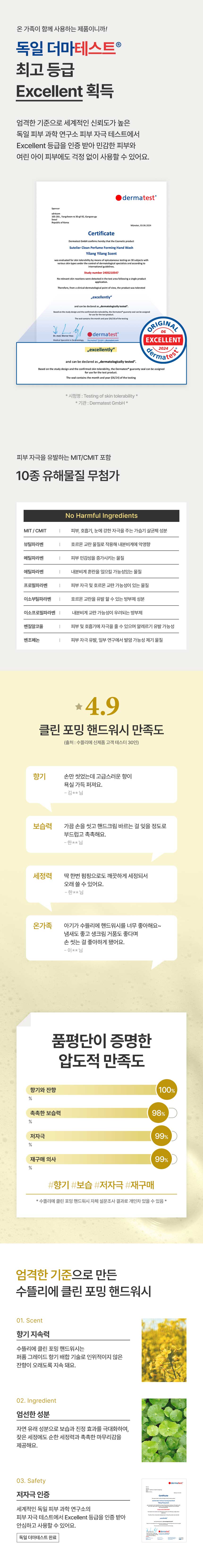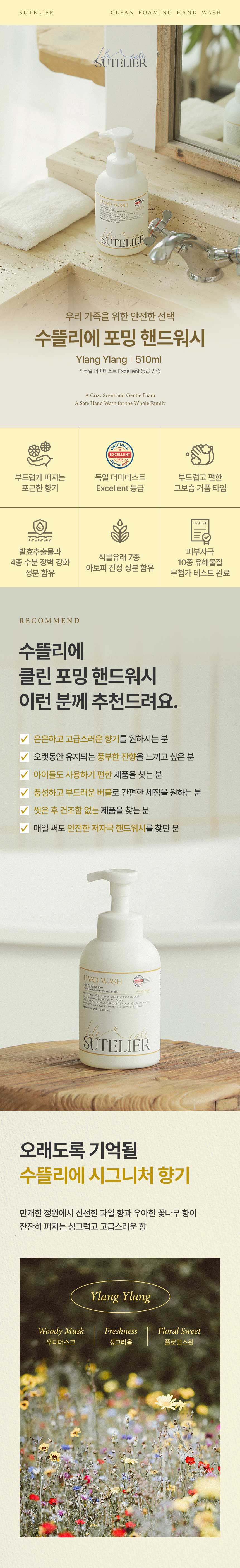The scent of a blooming garden in a single wash. SUTELIER’s Ylang Ylang hand wash offers a refreshing and luxurious aroma where fresh fruit notes meet elegant floral trees. Using premium perfume-grade blending technology, it leaves a natural, lingering trail that calms the mind. Awarded the "Excellent" grade by Germany’s Dermatest, this low-pH bubble formula is designed for safety and intense hydration, making it ideal for sensitive and atopy-prone skin.
