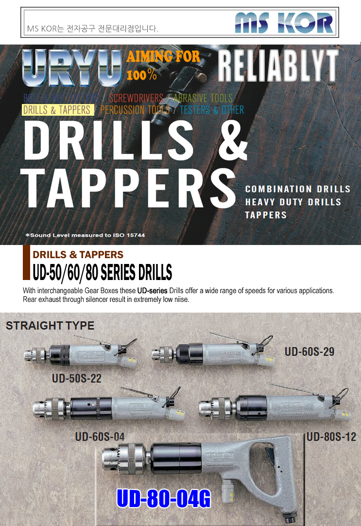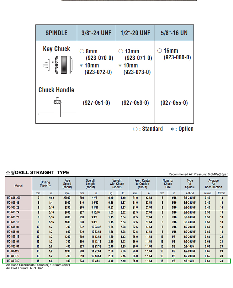 URYU AIR DRILLS AND TAPPERS (HANDLE-TYPE) UD-80-04G, Drilling Size 16mm, 400 RPM, Air Hose 9.5mm, Chuck Size 16mm