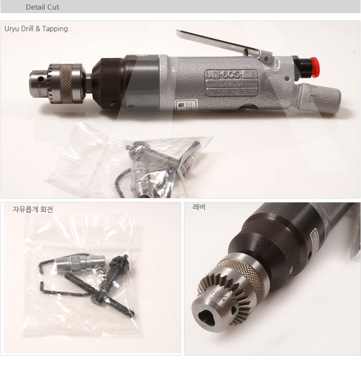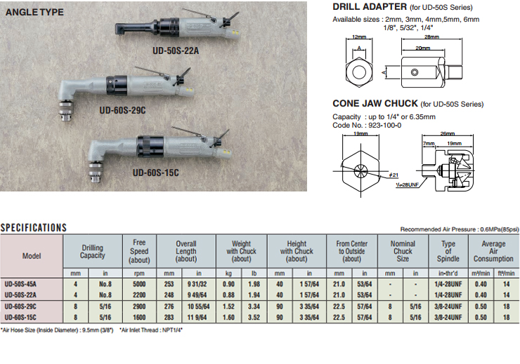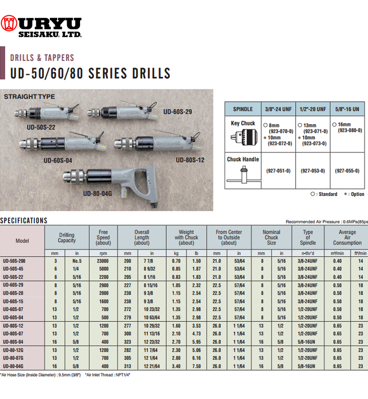 URYU AIR DRILLS AND TAPPERS (STRAIGHT-TYPE) UD-60S-29, Drilling Size 8mm, 2900 RPM, Air Hose 9.5mm, Chuck Size 8mm