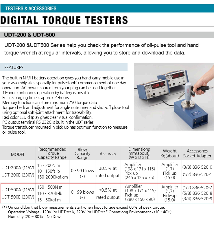 URYU DIGITAL TORQUE TESTER UDT-500A (115V), Torque Range 150-500Nm, 0-99 blows